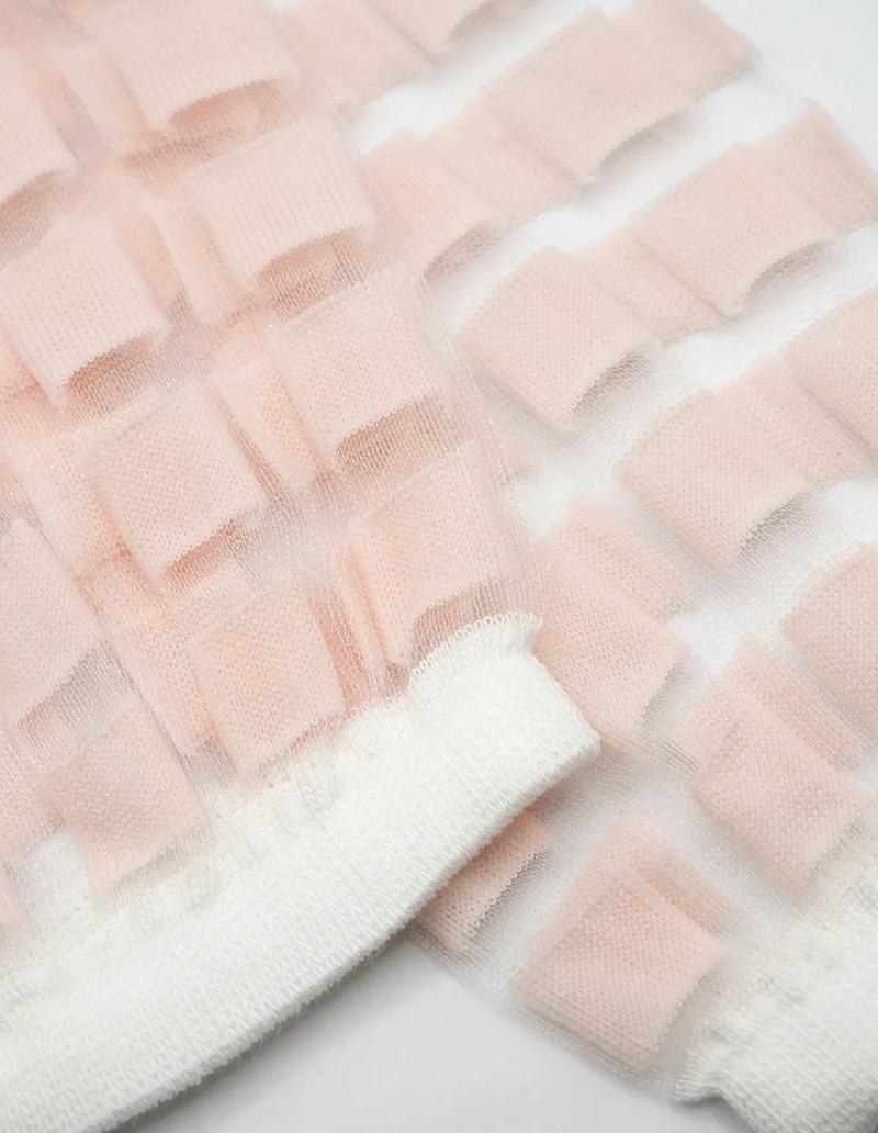 Ginza Powdered Socks from Atelier St Eustache features a sheer design inspired by the architectural lines of the Ginza district in Tokyo, known for its striking skyline and modern buildings. The pattern reveals soft, powdered pink geometric shapes that create a refined and distinctive detail.