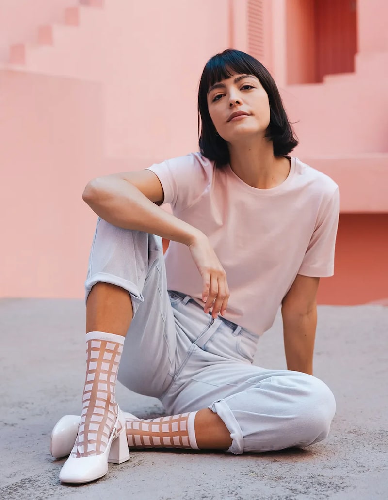 They are super easy to style – they pair naturally with white shoes and light denim, adding subtle color and texture to a relaxed outfit. The transparent fabric highlights the graphic motif while keeping the look polished and modern.